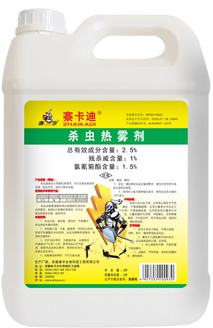 ·以擬除蟲菊酯為有效成分,高效、低毒。不僅具有觸殺,而且具有胃毒作用。雙重作用方式對蚊、蠅、蟑螂等多種衛(wèi)生害蟲具有良好的殺滅效果。品不用稀釋,可直接加入熱霧機(jī)進(jìn)行噴煙(霧)作業(yè)。使用劑量為1-1.5毫升制劑/立方米。